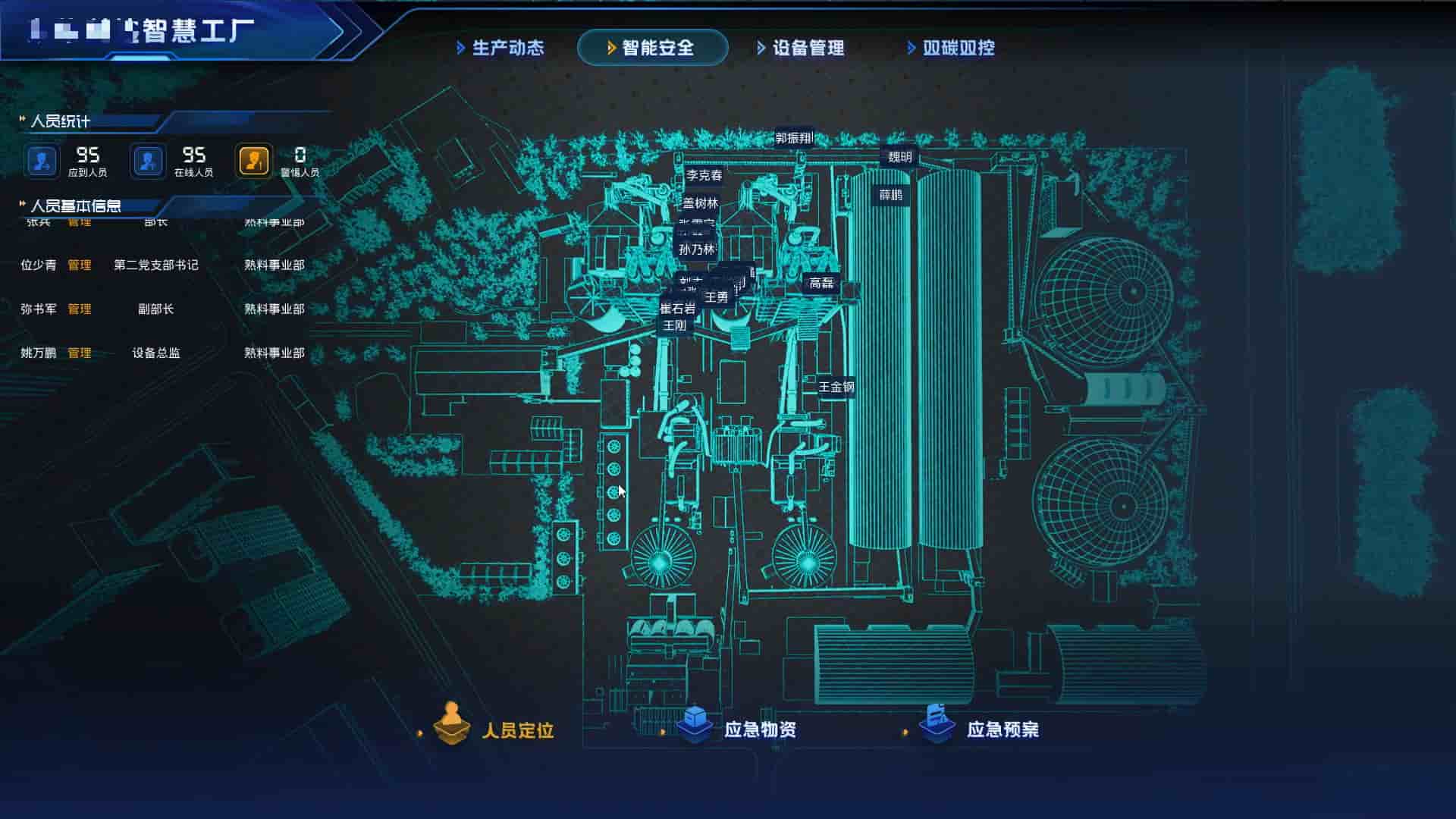 集成人员实时定位、门禁视频联动、应急物资分布与应急预案数字化管理。 实现从风险预警、人员疏散到应急指挥的全链路安全闭环。
